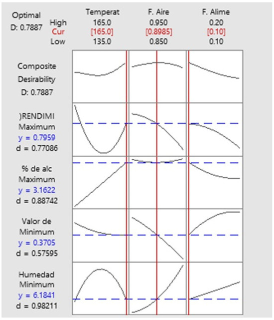 The optimization of the ChG drying process through the second-order quadratic model is presented in Figure 1. The optimal conditions of the Box–Behnken design were Temperature (165 °C), Air flow (0.89 mL/min), and Feed flow (1.67 mL/min) with 6.61% moisture, 0.52 water activity, 0.50% alcohol, and 0.30% yield.