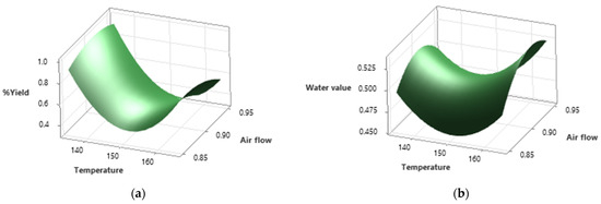 Surface plot of the optimized ChG drying process. (a) Surface graph of the efficiency (%) of the optimized ChG drying process as a function of temperature (°C) and air flow (mL/min). (b) Surface graph of the water value of the optimized ChG drying process as a function of temperature (°C) and air flow (mL/min).