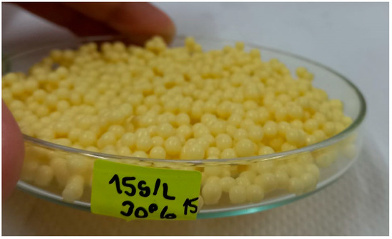 The microemulsion was combined with 40 mL of sodium alginate by stirring at 14,000 rpm, and then this mixture, with the help of a peristaltic pump, was dripped onto a 200 mL solution of calcium chloride (0.2 M) with constant stirring at 250 rpm for 30 min to obtain beads of a spherical shape. To remove excess calcium chlorine, the beads were washed with distilled water and then dried in a food dryer (IKE, Guangdong, China) at 40 °C for 30 min, as shown in Figure 1.