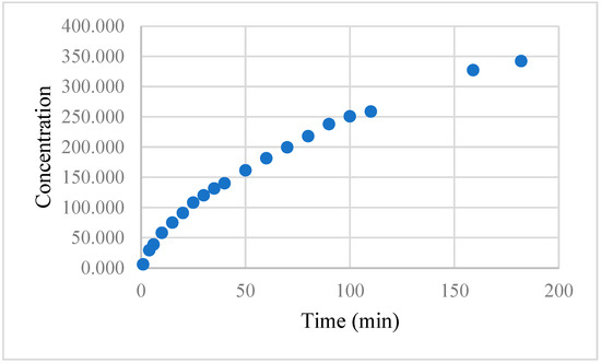 The process began with 5 g of beads in 300 mL of absolute ethanol, and the mixture was kept under constant agitation at 300 rpm throughout the course of the kinetics. To follow the kinetics of the capsaicin release process, 5 mL aliquots were taken at different time intervals. To determine the concentration of capsaicin in each aliquot, the spectrophotometric method (Thermo Fisher Scientific, Waltham, MA, USA) was used, measuring the absorbance at the wavelength λ = 281 nm. The release kinetics of capsaicin corresponded to concentration versus time and was obtained based on the calibration curve, as shown in Figure 2.