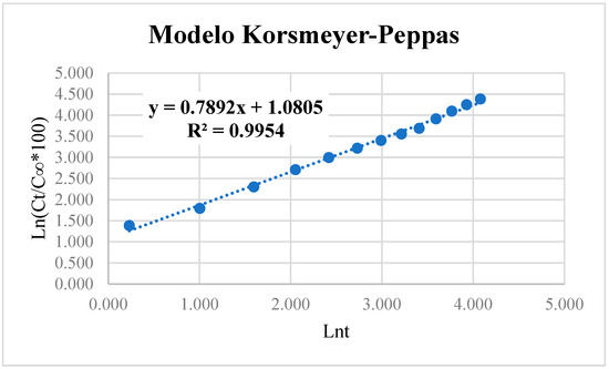 The release kinetics are described by the Korsmeyer–Peppas model [9], whose linear form is expressed through Equation (1), where the constant n indicates the release mechanism, K is the velocity constant, and the relation represents the fraction of capsaicin released. The results of the analysis of the experimental data based on Equation (1) using the least squares statistical method is as shown in Figure 3.