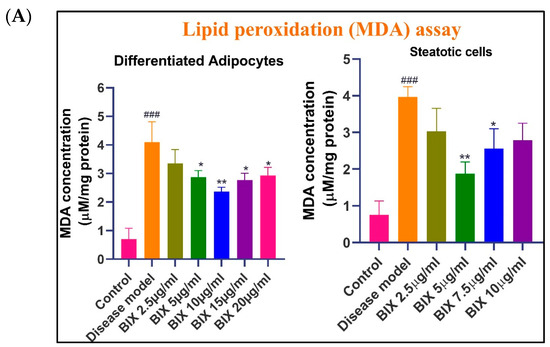 Quantification of oxidative stress in in vitro disease models. Panel (A) illustrates the dose-dependent effects of Bixin on MDA levels in matured adipocytes and steatotic cells. Panel (B) presents the effects of Bixin on nitrite levels in matured adipocytes and steatotic cells. Panel (C) demonstrates the dose-dependent effects of Bixin on the total ROS/RNS levels in matured adipocytes and steatotic cells. Preadipocytes and Non-steatotic HepG2 cells were used as the control cells, respectively. Values are expressed as mean ± S.D. in three independent experiments, each carried out in duplicate or triplicate sets. Statistical comparisons are as follows: ### p < 0.001, relative to the control group. * p < 0.05, ** p < 0.01, and *** p < 0.001 relative to the disease model group.