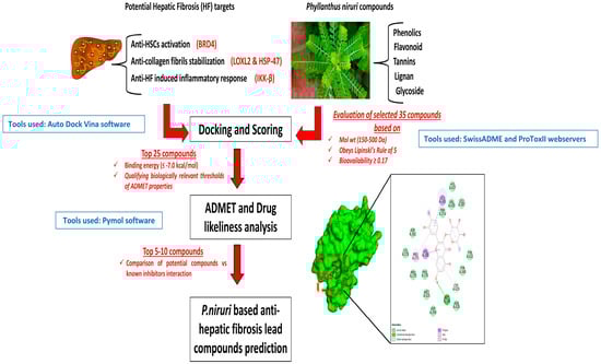 Phyllanthus niruri, an Indian herb belonging to the Euphorbiaceae family, is lauded for its anti-cancer [9] and hepato-protective effects [10]. Numerous studies have vouched for the potential of multiple natural plant-derived phytochemicals to alleviate or improve hepatic fibrosis via an array of molecular mechanisms. Key transcription cum epigenetic regulator protein, Bromodomain protein 4 (BRD4), is found to be overexpressed in HSCs in promoting its trans-activation via inhibition of its apoptosis through the P300/H3K27ac/PLK1 axis [11,12]. The heat shock protein 47 (HSP47) is a collagen-specific ER-chaperon, which aids collagen triple helix formation and efficient folding. Additionally, the interaction between HSP47 and the NLRP3 inflammasome further promotes HSC activation and fibrosis progression [13,14]. The ECM crosslinking cum stabilizing protein lysyl oxidase-like 2 (LOXL2) has been identified to have prime mediation in collagen remodeling and stabilization [15,16]. Similarly, the IKKβ alias IKK2 kinase has been accorded to activate the NF-κB via phosphorylation for aggravating hepatic inflammation and HSCs activation cum apoptosis inhibition via TGF-β1 and IL-6 stimulation [17,18]. This study aimed to explore novel P. niruri phytochemicals-based inhibitors of LOXL2, HSP47, BRD4, and IKKβ which have been speculated to impact some of the key features of liver fibrosis like activation of HSCs, stabilization of collagen fibrils and induction of hepatic inflammation using in silico analysis. By conducting in silico ADME analysis and molecular docking studies, a comprehensive assessment of the binding interactions and druggability of many P. niruri compounds against liver fibrosis has been explored in this research. The schematic workflow adopted for this research is shown in Figure 1.