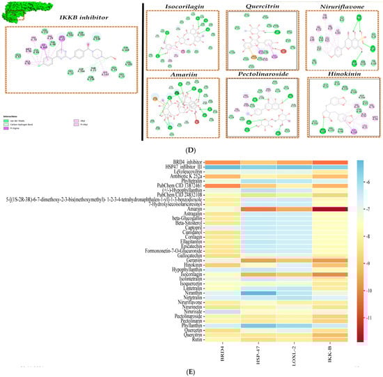 Molecular interactions of phytochemicals of P. niruri. (A) BRD4 protein, (B) HSP47 protein, (C) LOXL2 protein, (D) IKKB protein, and (E) Heat Map of Binding energy (scores kcal/mol).