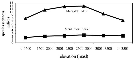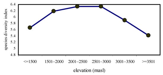 The highest species diversity (H’ = 6.34) and species richness values (R1 = 2.497; R2 = 12.01) were observed at 2501–2500 masl. However, the lowest species diversity (H’ = 5.42) and species richness values (R1 = 2.247; R2 = 7.341) were noted at ≥3501 masl. The formation of a mid-elevation peak in species diversity and species richness was the characteristic feature of this study (Figure 1 and Figure 2).