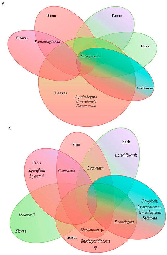 Diversity of yeasts associated with mangrove plant parts of A. officinalis in two stations: (A) Kumbalam and (B) Puthuvype.