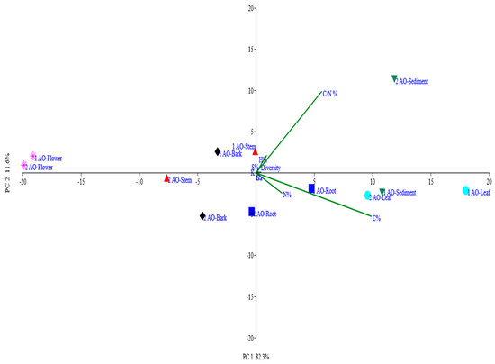 Multivariate Principal Component Analysis (PCA) of the relationship between the plant elemental composition and diversity of yeasts associated with A. officinalis found in Kumbalam and Puthuvype revealed that 93% of the total variance within the data set could be accounted for by the first two principal components, PC1 and PC2 (Figure 4). The proportion of the total variance captured by PC1 and PC2 is indicated on the axes. For example, PC1 explained 82% of the variance, while PC2 explained 11%, capturing 93% of the total variance. The direction and length of vectors show the influence of specific environmental parameters. Parameters pointing in the same direction are positively correlated, while those pointing in opposite directions are negatively correlated. Clusters of points may reveal patterns of diversity in relation to environmental gradients. For instance, samples with similar environmental parameters may exhibit similar levels of diversity. In the present figure (Figure 4), in both samples flowers clustered together, whereas the sediment in both sets of samples showed some dissimilarities. Points that are distant from others might be outliers, indicating unique environmental conditions or diversity profiles. In the present figure, we can consider flowers to be the outliers. It was clear that C/N% and C% are the major plant parameters that influence the diversity and distribution of yeasts associated with the mangrove species A. officinalis. It was also clear that the diversity found in the flowers of A. officinalis was least influenced by the elemental composition, as they were outliers.