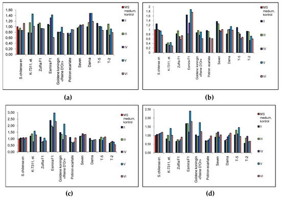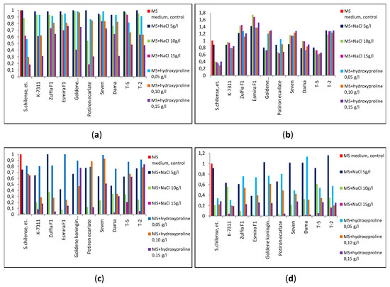 It was found that NaCl had a much stronger effect on the rhizogenesis of tomato regenerating plants than hydroxyproline. The length of the roots of regressive plants decreased proportionally with increasing concentration of both studied selective agents (Figure 1d). On media with minimal NaCl content in samples Seven, Dama, Zulfia F1, Goldene koningin “Reine D’Or”, and in Dama—and on media with minimal hydroxyproline content, the root length was at the control level and even slightly exceeded it, which indicates a higher compared to other samples resistance of these genotypes to osmotic stress. However, a further increase in the concentration of selective substances led to a decrease in root length in these samples.