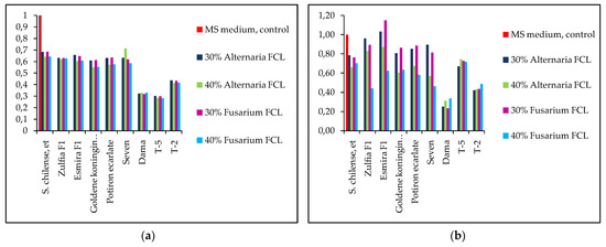 For screening of tomato genotypes for disease resistance we studied the efficiency of cultivation of callus and tomato shoots on selective media with different concentrations of FCL of Alternia spp. and Fusarium spp. Cultivation of calluses on a nutrient medium with the addition of 30% concentration of FCL of the fungus Alternaria spp. did not allow to clearly differentiate the samples according to the indicator “callus volume” as its impact on the object was not significant (Figure 2a). Thus, in S. chilense (standard) it was—0.68. At the level of the standard there were samples of Esmira F1—0.66; Zulfia F1—0.63, Seven—0.63, Goldene koningin—0.63, Potiron ecarlate—0.63. It was noted that the calluses were green, they had a loose texture with foci of organogenesis.