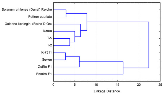 The first group includes 6 samples (Solanum chilense, Potiron ecarlate, Golden konongin “Reine D’or”, Dama, T-5, T-2), which according to the field assessment are suitable for growing by organic technologies, the second 4 samples (K-7311, Seven, Zulfia F1, Esmira F1), high-yielding varieties and hybrids recommended for intensive tomato growing technologies.