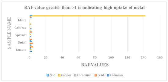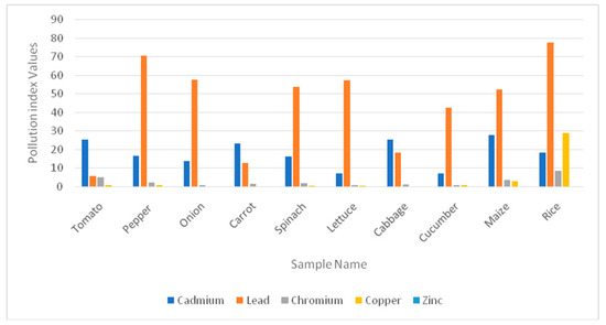 The bioaccumulation factor (BAF) of heavy metals was BAF > 1 for Cd, Pb, and Zn and the BAF was in the decreasing order of Cu > Zn > Pb > Cd > Cr (Figure 1). Pollution indices (PI) were >1 for Cd and Pb in all crops and in most crops for Cr (Figure 2). The estimated daily intake of metal (EDI) for adults exceeded the USEPA, ref. [10] oral reference dose daily limit in all the crops for Cd and Pb (Table 3). The EDI for Cr, Zn, and Cu were below the USEPA [10] except in Solanum lycopersicum, Brassica oleracea, and Oryza sativa for Cu. (Table 3). EDI values were in decreasing order of Cu > Pb > Cr > Cd > Zn. Hazard quotient (HQ) values were not detected for Zn and >1 for Oryza sativa. (Table 4). The HI values for all crops were >1 (4.666) in Oryza sativa, (1.475) Zea mays, (1.132), and capsicum annuum.