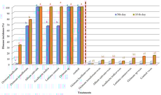 Plant extracts were prepared and tested on papaya fruits with and without edible bee wax coating. Disease incidence and severity were observed every day (Figure 1 and Figure 2). The highest incidence and severity were recorded in the absence of a wax coat. Among the wax-free treatments, O. cinnamon, control, A. sativum showed 100% incidence within 5 days, but others showed an incidence of 60%, excluding O. basilicum which was free from disease (Incidence 0%). At 10 days after inoculation, all the botanically treated fruits had a disease incidence of 100%, excluding O. basilicum and O. tenuiforum, which had 33.34% and 77.78% incidences, respectively.