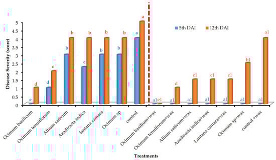 Among the wax-coated treatments, anthracnose disease incidence was comparably very low. Disease incidence was 0% on the fifth day of inoculation in all treatments, whereas on the tenth day of inoculation, disease incidence varied from 0–15% (Figure 1). The control set exhibited a papaya anthracnose disease severity score of 5 (80–100%) at 12th days of inoculation, whereas the O. basilicum showed a lower value disease severity score of 0 (0%) (Figure 2). Other treatments of wax-coated fruits exhibited a level of disease severity score from 1–4, but the level of severity was less than fruits without wax applied.