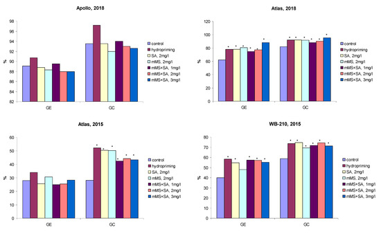 The data showed that the highest germination rates were obtained for the seeds of the Apollo hybrid, i.e., 89.1% and 93.5%, correspondingly; additional pre-sowing treatment did not change these indices. Hydro- and nutrient priming improved the germination energy and capacity of the Atlas hybrid seed 2018 reproduction, the highest result was obtained for the variant with mMS 3 mg/L + SA 3 mg/L (88.3% and 95.5%, respectively) (Figure 1). The asparagus hybrids seeds of 2015 reproduction had low indices of germination energy and capacity. Hydro- and nutrient priming of Atlas and WB 210 hybrids seeds 2015 reproduction increased the germination capacity. The highest result was obtained after hydropriming of Atlas (73.7%) and SA 2 mg/L (74.6%) or mMS 2 mg/L + SA 2 mg/L (74.3%) treatment of WB-210 hybrid seeds (Figure 1).