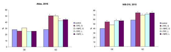 Effect of different low-temperature treatments on germination energy and capacity of asparagus hybrids 2015 reproduction (%): GE—germination energy; GC—germination capacity; *—differences are significant if compared with the control group, p < 0.05.