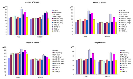 Yield study of growing the Atlas 2015 seedlings showed increase in shoots’ height for all the variants of pretreatment (low temperatures, hydro- and nutrient priming) compared with the control indices (67.3–83.5% vs. 54.7%). Increase of shoots number, their weight and roots weight were observed only after low-temperatures treatment down to −70 °C. The seedlings obtained from the seeds cooled in 1.8 mL containers showed a bigger number of shoots (18.3), increase weight of shoots (154.4 g) and roots (104.4 g) compared with the control value (11.9 units, 81.0 and 62.0 g respectively), in case of 50 mL cryovials shoots number were 16.0, their weight was 139.5 g and roots weight made 91.6 g. Freezing of seeds in 1.8 mL cryovials down to liquid nitrogen temperature led to an increase in number of shoots (14.3) and their weight (134.2) (Figure 3).