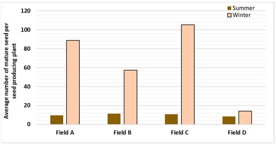 The percentage of plants bearing mature seeds is not much varied in summer (50.6%) and winter (53.0%). However, the intensity of seed production per seed producing plant was greatly influenced by the season (Figure 1). Th enumber of seeds per seed producing plant was higher in winter (72.5 seeds) as compared with summer (10.2 seeds). In winter, a higher average number of seeds per seed producing plant was observed in field C (105.3 seeds) and lowest in field D (13.9 seeds).