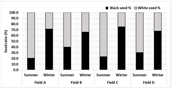 Seed ratio and seed weight in summer (July 2017) and winter (November–December 2017) were calculated by counting the black and white seeds of each plant and then weighing them. Seed weight (1000 seeds) is calculated by the following method: