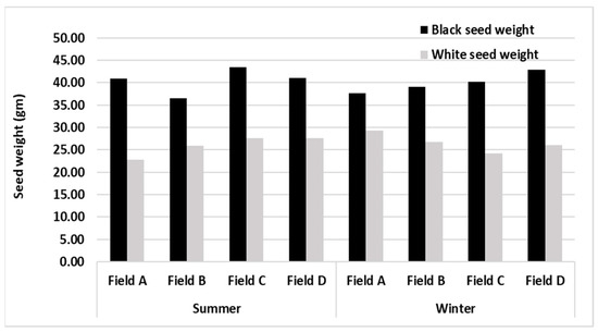Comparison of black and white seed weight in summer and winter showed that black seed weight was almost similar both in summer and winter (39.6 and 40.0, respectively) but higher than white seed weight (summer, 25.8 g and winter, 26.1 g). Black seed weight was highest in field C (43.5 gm), whereas in winter higher black seed weight was found in field D (42.87 gm; Figure 3).