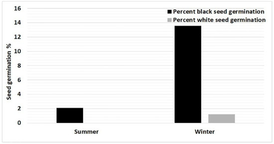 Overall germination (about 1%) was very poor in the summer collected seeds. In summer, black seed germination percentage was 2.1% and white seeds failed to germinate (zero percent), whereas, winter collected black seeds germination was relatively higher (13.6%), and few white seeds germinated (1.2%; Figure 4). The amount of total mature seeds collected in winter was almost seven times higher as compared with summer.