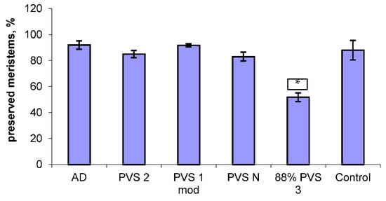 An important indicator of successful cryopreservation is a high level of meristems preservation after pre-treatment before immersion into LN. It was shown that the survival rate meristems did not exceed 55% after treatment with 88% PVS 3. The preservation rates after PVS 2 and PVS N exposure were 83 and 85% respectively. The highest number of preserved specimens was noted after dehydration with airflow (89–95) and modified PVS 1 (88–94%). Since a decrease in the viability of the meristems was also observed in the control meristems (88%), most likely it was connected with their damage during isolation (