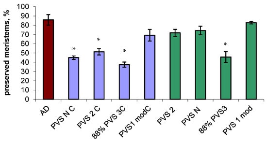Figure 2). The highest post-thaw preservation was found for pretreatment with modified PVS 1 (81–84%). The lowest survival rates were observed in the case with 88% PVS 3 (40–51%). The meristems treated with PVS 2 and PVS N showed survival indices of 68–75 and 70–78% respectively.