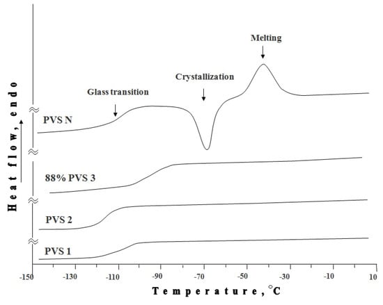 DSC thermograms of modified PVS 1, PVS 2, and 88% PVS 3 revealed only one heat capacity jump at temperature Tg (−109; −115.3; −93.9 respectively), associated with a reverse glass transition process (transition from a solid amorphous to of supercooled liquid state). No exo- or endothermic peaks were recorded, indicating no crystallization, both at cooling and warming stage. This fact testifies that at the cooling stage the modified PVS 1, PVS 2, and 88% PVS 3 are completely transformed into a glassy state with highly stable amorphous phase, which does not crystallize even under slow warming above the glass transition temperature. In the thermogram of PVS N, in addition to the glass transition, an exothermic crystallization from an amorphous state (devitrification) peak and an endothermic peak of melting were recorded (