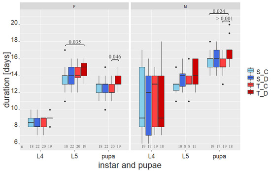The duration of the instars and pupal stage is shown in Figure 1. Both females and males showed no significant difference in the duration of the fourth instar. The fifth instar of the females lasted significantly longer for the T_D group than those of the S-oak control group (S_C), while the males showed no significant differences. The pupal stage in males lasted significantly longer in the T_D group than in both control groups (T_C and S_C), whereas female pupae showed a significantly slower development only for T_D compared to T_C (Figure 1).