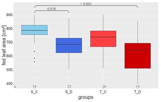 For L. dispar, the total leaf area fed was measured from the fourth instar until pupation. Female larvae of the S_C group ate significantly more leaves than the larvae of the S_D (posthoc.kruskal.nemenyi.test p = 0.038) and T_D (posthoc.kruskal.nemenyi.test p > 0.001) groups, while the larvae of the T_C group did not differ from the others (Figure 2).