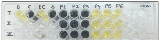 PPA inhibitory activity of various plant extracts using qualitative starch iodide assay: B: blank, C: control, EC: enzyme control, SC: substrate (drug) control, P1: pet ether, P2: chloroform, P3: ethyl acetate, P4: acetone, P5: methanol, P6: water.