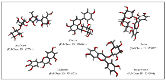 The 3D ligand structures used in docking studies for targeting alpha-amylase enzyme.