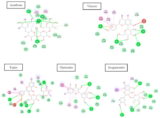 The four flavonoids, vitexin, rutin, myricetin, and isoquercetin were docked onto the PPA enzyme structure because they had shown better or comparable PPA inhibitory results to acarbose, the positive control used in our experiments. The mechanism of action of flavonoids suggests that the binding of these flavonoids depends on their structure and the bonding pattern with the receptor molecule. The conjugated π system formation is important for the stabilisation of the interaction with the binding pocket. In our study, it was observed that all four flavonoids formed π interactions with active site amino acid residues (Figure 6). These π interactions were π–anion, π–alkyl, π–π T-shaped, π–π stacked, π–sigma, and π–donor hydrogen bond. When acarbose was studied for its π interactions, it was observed that no π interactions were formed by acarbose with a target protein. These results provided insight into the higher binding energy of flavonoids than acarbose. The π interactions formed between the flavonoid and target protein strengthened the binding and resulted in a significant docking score.