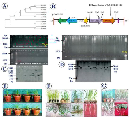 Overview of the DREB2 transformation and the salinity and drought tolerance in Eleusine coracana cultivars. (A) The phylogenetic tree of abiotic stress responsible DREB and their strong homology between other DREB genes; (B) Schematic diagram of the T-DNA region of pSBI with EaDREB2 gene; (C,D) PCR and Southern blot analysis of T0 and T1 lines of lines of finger millet; (E–G) Evaluation of finger millet transgenic lines expressing EaDREB2 gene and un-transformed control plants under salinity and drought stress conditions.