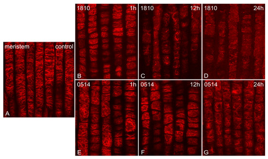 The extracts of both NMP strains induced time-dependent alterations on F-actin. The fine actin filaments observed in control root tips (Figure 1A) were significantly affected, starting from 1 h of treatment. Roots treated with the 1810 extract exhibited more severe alterations, ranging from bundling after 1 h of treatment (Figure 1B) to the formation of thick F-actin aggregates after 12 h (Figure 1C) and, eventually, the total collapse of F-actin network after 24 h (Figure 1D). Roots treated with the 0514 extract exhibited milder alterations, mainly disorientation, which was detectable at all time points and intensified progressively (Figure 1E–G).