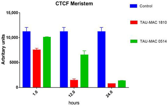 CTCF measurements (Figure 2) showed that fluorescence intensity in extract-treated meristematic root cells decreased progressively. Even after short treatments (1 h), the intensity was significantly lower compared to control cells. The lowest levels were recorded after 24 h.