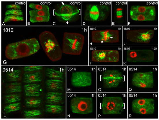 Both cyanobacterial extracts induced alterations in the microtubule network (Figure 3). Meristematic cells treated with the 1810 extract exhibited major defects after 1 h of treatment (Figure 3G–J), which eventually led to the disappearance of microtubules after 12 h, in parallel with abnormal chromatin condensation (Figure 3K). The effect of 0514 extract was not as acute, as only minor defects were observed after 1 h of treatment (L-R). No significant alterations were detected after longer treatments.