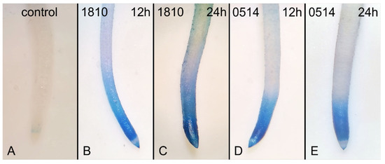 The occurrence of dead cells in extract-treated roots was confirmed by Evans Blue staining (Figure 4). Dead cells were detected at all time points and the effects were particularly harsh after 24 h of treatment with the 1810 extract (Figure 4B).