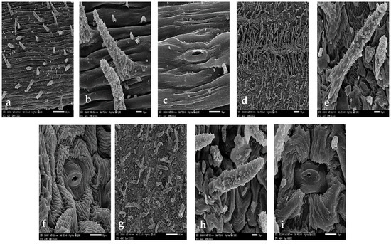 Scanning Electron Microscope (SEM) photo-micrographs of Silene leucophylla. (a–c) stem. (d–i) leaf. (a) surface. (b) trichome. (c) stomata. (d) abaxial surface. (e) abaxial trichome. (f) abaxial stomata. (g) adaxial surface. (h) adaxial trichome. (i) adaxial stomata.