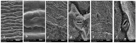 SEM micrographs of Silene schimperiana. (a,b) stem. (c–f) leaf. (a) surface, (b) stomata. (c) abaxial surface. (d) abaxial stomata. (e) adaxial surface. (f) adaxial stomata.