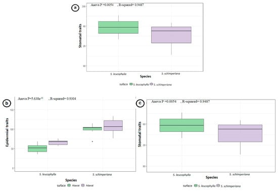 Geom_boxplot and ANOVA tests data were applied to the quantitative for measured stomatal characteristics (length, width, and area) and stomatal pores (length, width and area confirming the stomatal variations of the two species with analysis significant p-values (p = 0.0054 **, R-squared = 0.9487), which showed a the higher median for the stem stomata of S. leucophylla (p = 0.00713 **) than S. schimperiana (p = 0.00563 **) (Figure 3a).