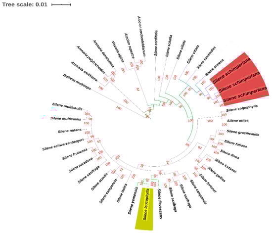 Phylogenetic analysis is essential for identifyingstructural and functional characteristics related to biodiversity against an evolutionary background [17]; therefore, the utilization of the phylogenetic data is important for ecological, taxonomical, and evolution studies [18,19]. Identifying the phylogenetic relationships of large genera such as Silene is always challenging. A new taxonomic underpinning study of the infrageneric classification of Silene species based on nrDNA ITS and cpDNA rps16 sequences was has been conducted by Jafai et al. [4]. In the current study, the morphological and molecular phylogenetic data for S. leucophylla and S. schimperiana species were merged. The aim of the current study was to contribute to designation and identification of these species by, and revealing the phylogenetic positions of those endemic species within the whole genus.