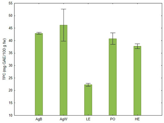 Total phenolic content quantification (mg GAE/100 g fw) based on Folin–Ciocalteu method. Results are presented as means ± standard deviation (SD) (n = 3).