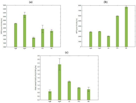 Antioxidant activity determination following the methods: (a) DPPH; (b) ABTS; and (c) FRAP. Results are presented as means ± standard deviation (SD) (n = 3).