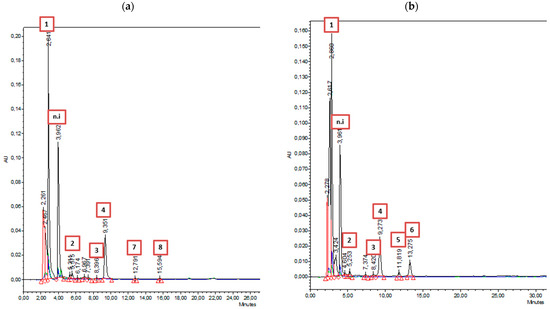 HPLC chromatogram of mushroom extracts at 280 nm and 325 nm: (a) AgW and (b) PO. Peaks: 1, ascorbic acid; 2, gallic acid; 3, protocatechuic acid; 4, chlorogenic acid; 5, catechin; 6, caffein; 7, hydroxybenzoic acid; 8, vanillic acid.