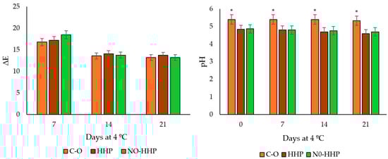 Color variations (ΔE) (left) and pH (right) variations during 21 days at 4 °C of reformulated cucumber juices. * Denotes statistical differences among samples (p < 0.05).