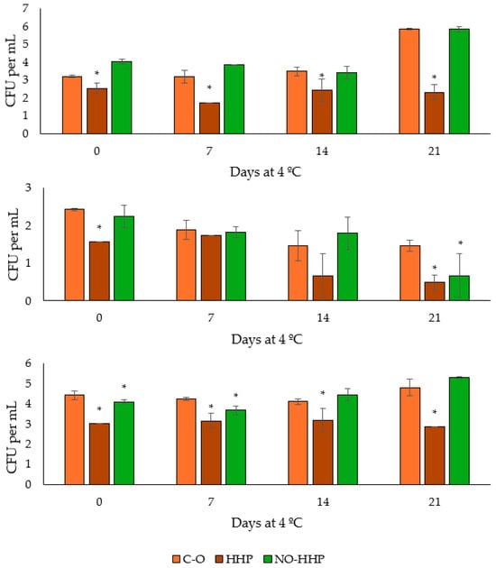 The effects of HHP treatment on microbial load are shown in Figure 2. In the case of HHP samples, mesophilic bacteria decreased by ~1 (at day 0) to ~4 (at the end of the storage) log CFU per mL, Enterobacteriaceae levels dropped by ~1 log CFU per mL (at the beginning and after 21 days storage), while mold and yeast counts also decreased by ~1–2 log CFU per mL compared to control samples (C-O and NO-HHP) by the end of the shelf-life study.