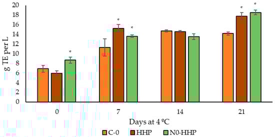 The antioxidant capacity (Figure 3) illustrates the significant impact of HHP treatment on maintaining the antioxidant levels of samples during the 21-day storage at 4 °C. On the 7th day of storage, the HHP treatment displayed a notable increase in antioxidant capacity (~16 g TE per L) compared to the C-O and NO-HHP samples, indicating better preservation of antioxidant compounds. From day 14 onward, all treatments exhibited an increasing trend, especially in those samples fortified with encapsulates of tomato by-products (HHP and NO-HHP, as shown by day 21), while the control (C-O) remained lower. These results highlight the positive effects of HHP in preserving antioxidant compounds and enhancing the long-term quality of the product.