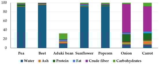 The time from seedling to harvesting mature microgreens in the second stage of true leaves differed considerably between the species examined. The growth period for onion and carrot was generally longer than for the other species. Significant differences (p ≤ 0.05) in the nutritional value and caloric intake were found among the studied species, with carrot and onion microvegetables distinguishing themselves for their mineral, calcium, and potassium content and crude fiber, as shown in Figure 1. For example, K and Na were found to have the highest concentrations in onion, carrot, and aduki bean microgreens; however, the onion exhibited the highest Mg content and popcorn the lowest Na/K ratio, detailed in Table 1. In sunflower microgreens, we found lower values than those reported by Ghoora et al. [11]; nerveless, the values of the mineral content of carrots and onions were much higher than those reported by the same authors [11].