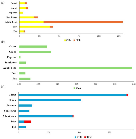 Bioactive compounds of microgreens. (a) Chl a: chlorophyll a and Chl b: chlorophyll b expressed as mg/100 g fw; (b) Cars: total carotenoids expressed as mg/100 g fw; (c) TPC: total phenol content expressed as mg GAE/100 g fw; TFC: total flavonoid content expressed as mgECat/g fw.