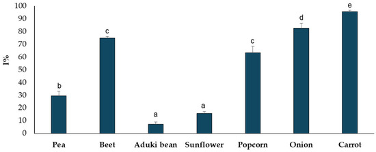 Antioxidant activity of microgreens expressed as the percentage of inhibition (I%) of the DPPH radical. Values with different letters present significant differences p ≤ 0.05.